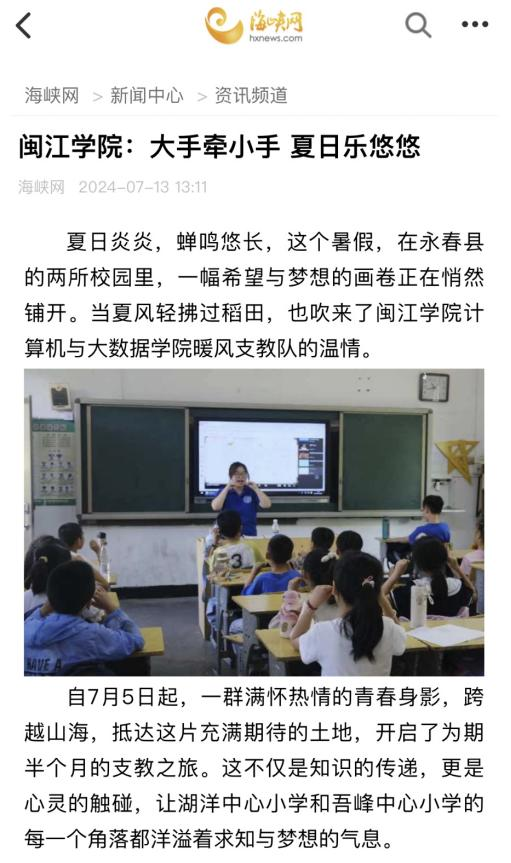 7月4日至15日,“编译七彩梦想,数写爱心篇章”暖风支教实践队恰似一颗播撒于泉州市永春县湖洋中心小学与吾峰中心小学心田的种子,悄然生根发芽,绘就了一幅以教育公平与乡村振兴为核心的壮丽画卷。暖风支教不仅仅是一场简单的支教行动,它更像是一个不断扩大的同心圆,圆心深深植根于对知识的渴望与对未来的憧憬之中,每一圈扩展都蕴含着无限的可能与温情。