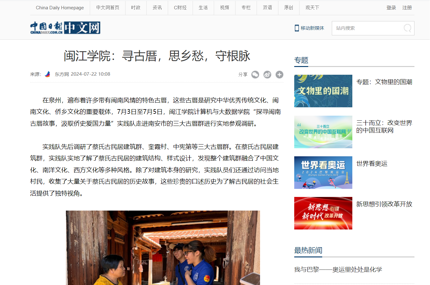 7月3日至5日,“行见八闽”大思政课研学实践专项队伍——“探寻闽南古厝故事,汲取侨史爱国力量”实践队,他们走进泉州南安古厝,深入了解闽南侨乡历史,传承和弘扬这份宝贵的文化遗产,汲取其中的爱国精神,用青春力量延续文化根脉。通过对南安三大古厝的实地调研参观,实践队员们直观感受到华侨华人“爱拼才会赢”的精神风貌,窥见了其背后展现的闽南人开朗、坚韧、豁达的性格,以及他们对家乡深深的眷恋与贡献。