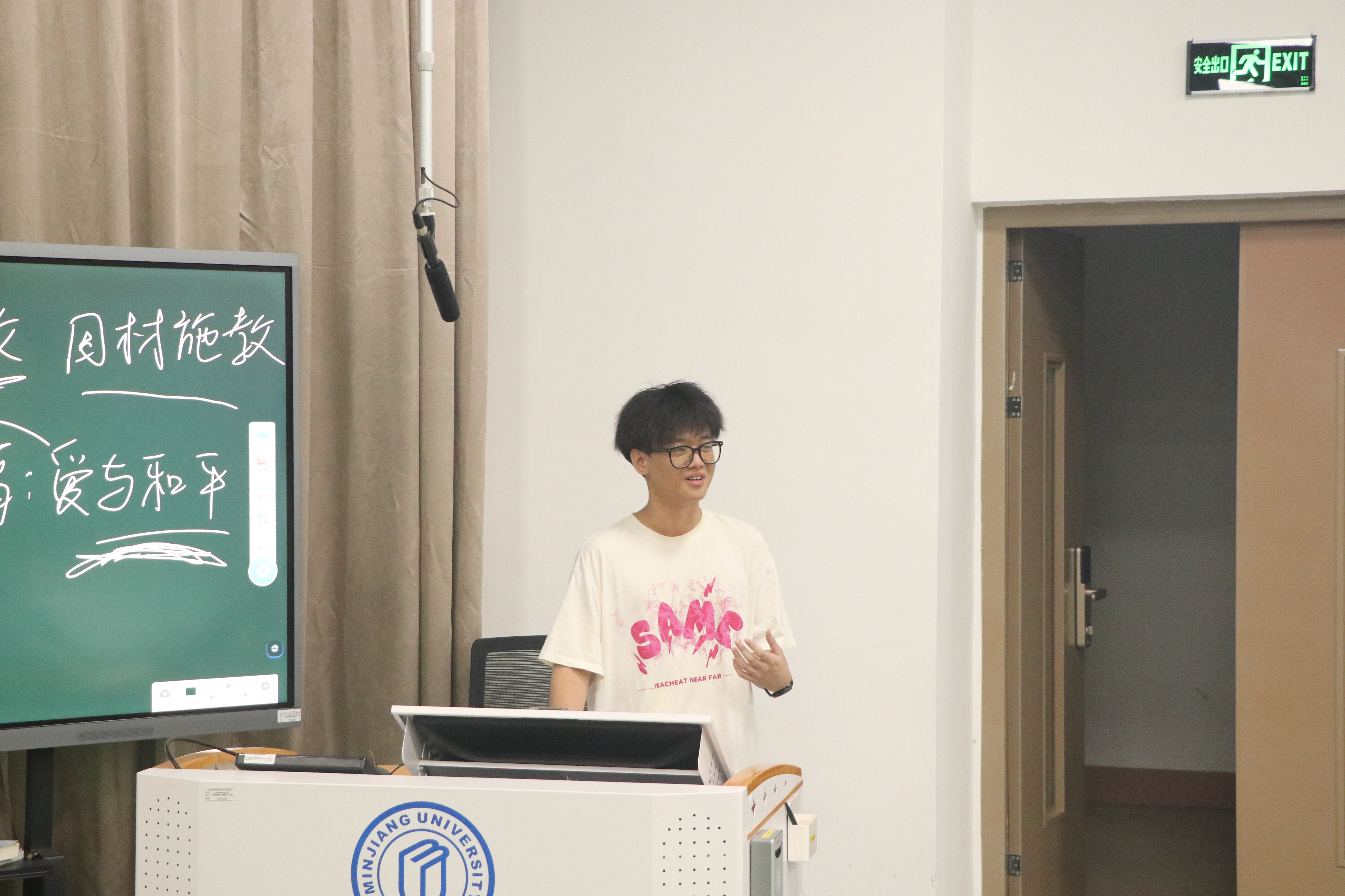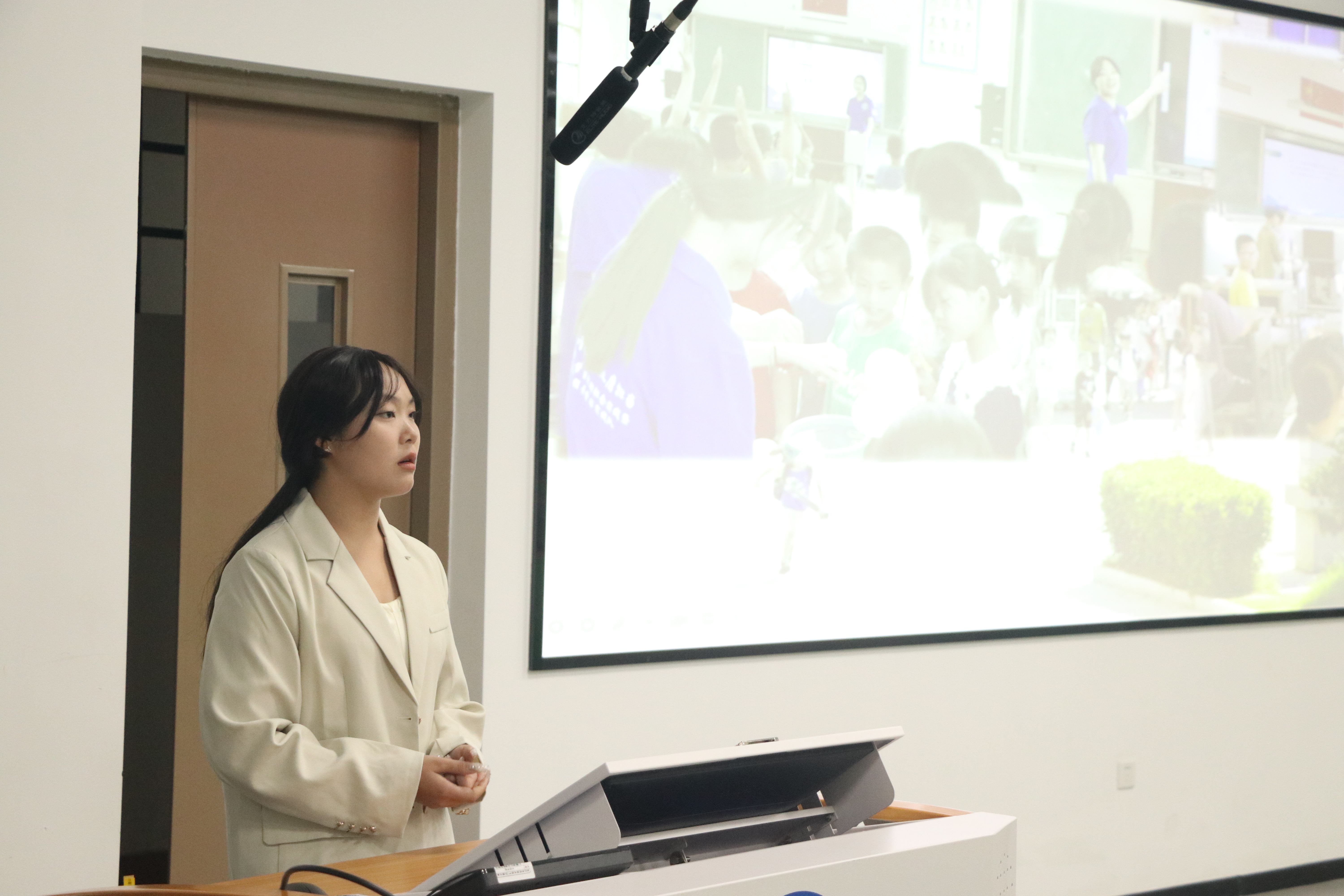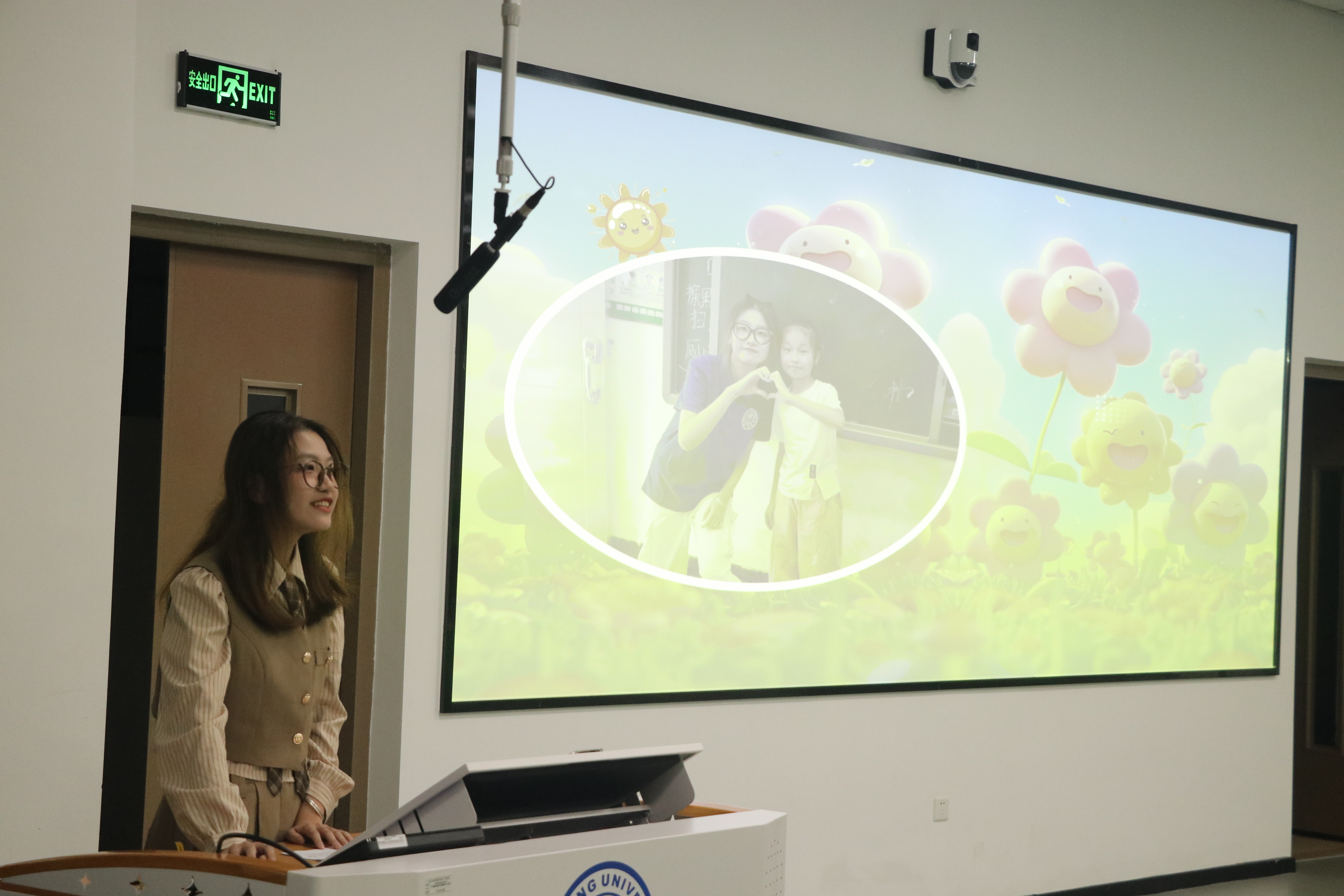 2023级数学与应用数学师范专业金奕飞同学系统地介绍了湖洋中心小学的支教课程和支教队员。课堂上,“音乐律动”、“模拟商店”、“诗词接龙”等课程让孩子们在轻松愉快的氛围中感受到了音乐、数学与语文的魅力,而“制作发电机”、“小投石机”、“牛奶动画”、“棍子跳舞”和“软件编程”等课程,则让孩子们化身小小科学家和程序员,亲手探索奇妙的科学世界。随着照片一张张地放出,孩子们纯真的笑脸也逐渐展现在我们眼前,每个孩子的故事也都深深触动了我们的内心。在艰苦的条件下,“金老师”亲手制作圆规,真心流露地说道“支教虽然苦,虽然累,但是非常值得。”最后,她感谢了公司和国家的支持,让她有机会到偏远山区中教导孩子们。她认为,教育要因材施教,要观察每个孩子的性格,走入孩子们的内心世界,从而达到育人的效果。