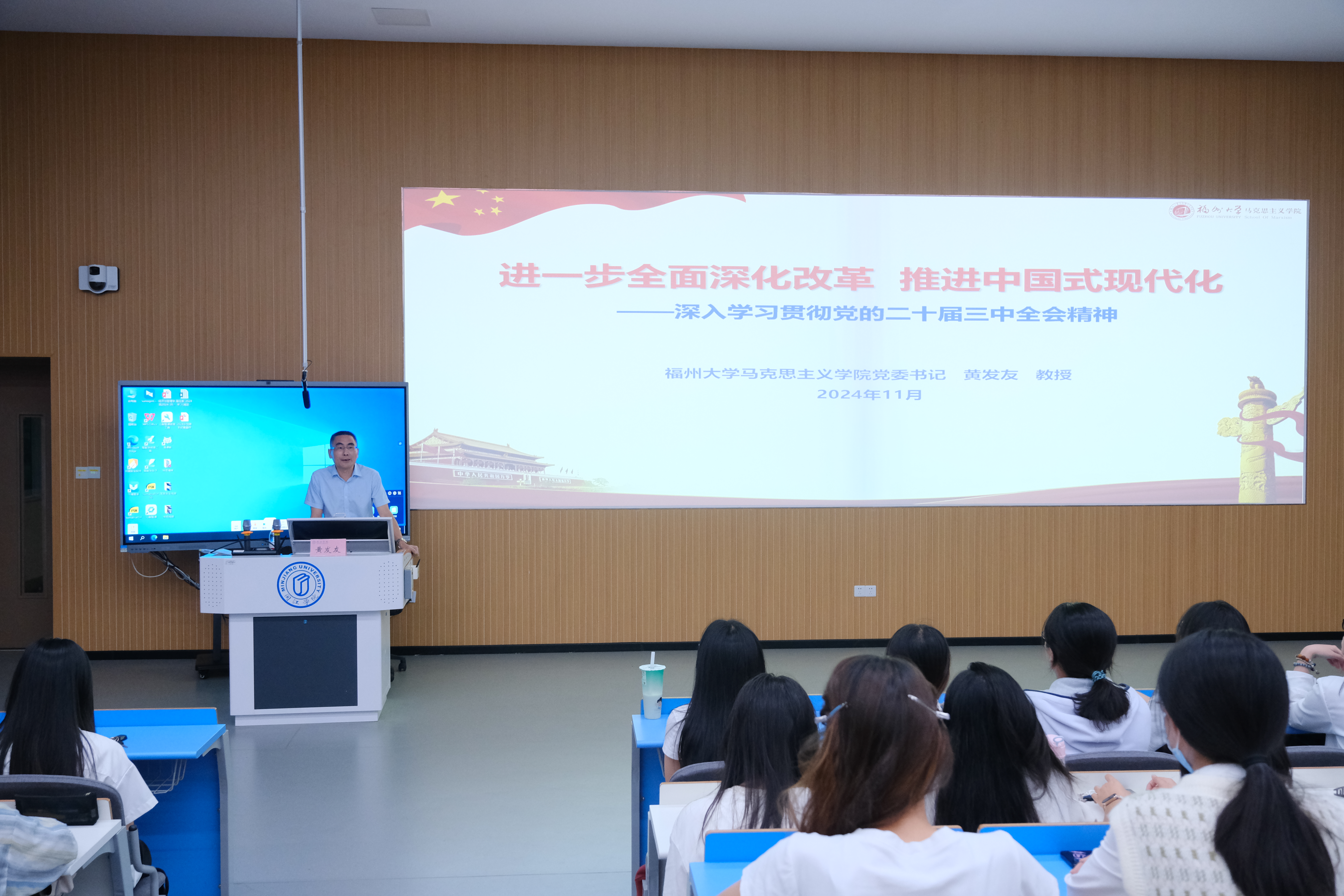 福州大学马克思主义公司党委书记黄发友教授以《进一步全面深化改革,推进中国式现代化》为题,围绕党的二十届三中全会的基本情况、精神解读以及全面深化改革福建探索实践等方面进行宣讲,带领同学们深入领会本次会议的重大意义、丰富内涵、精神实质、基本要求等。黄发友教授指出,要把学习党的二十届三中全会精神同学习贯彻习近平总书记在福州考察时的重要讲话精神紧密结合起来,进一步全面深化改革并奋力推进中国式现代化福建实践。并勉励同学们,心怀“国之大者”,汇聚青春力量,共同书写科技强国的时代篇章。