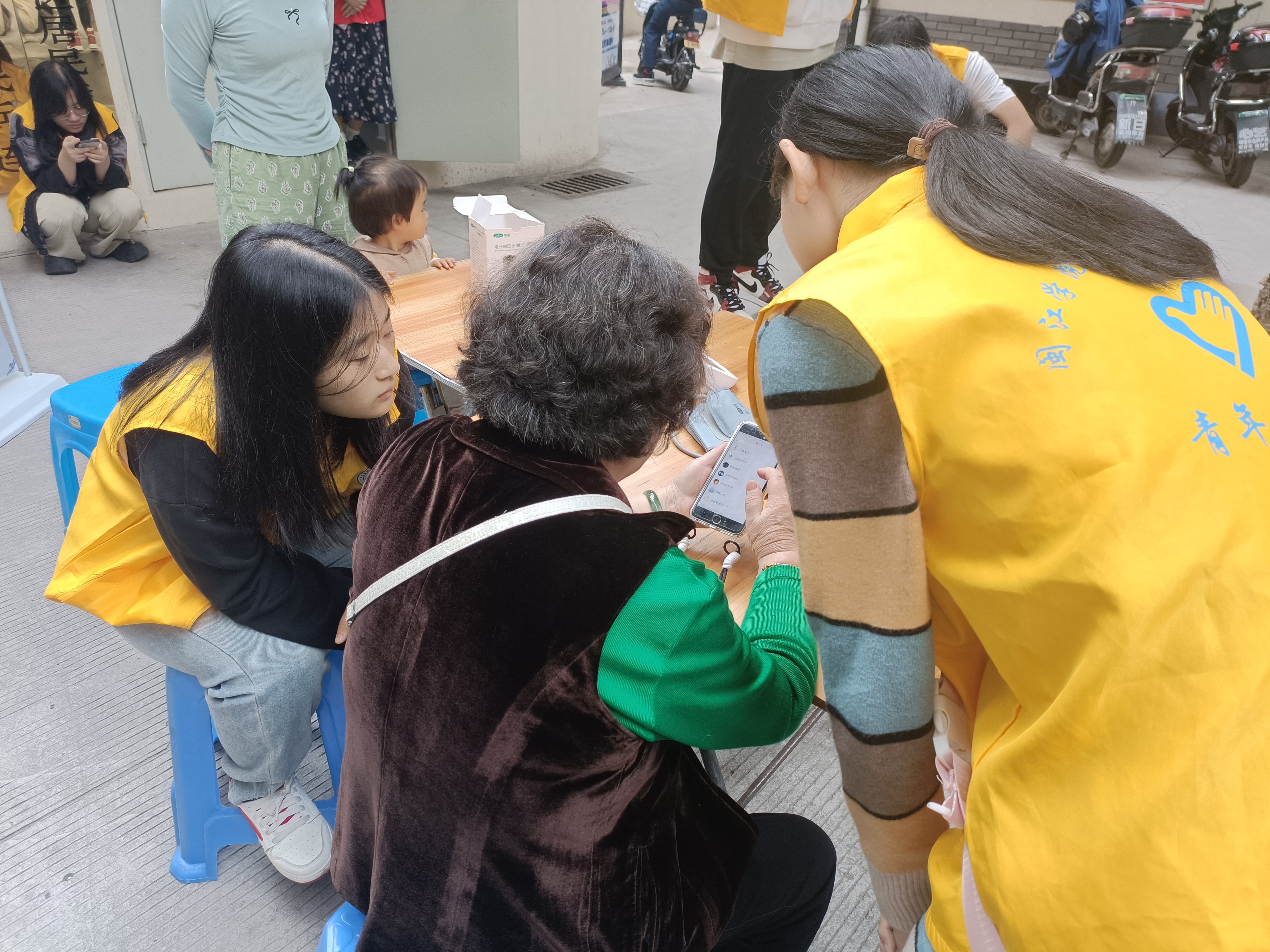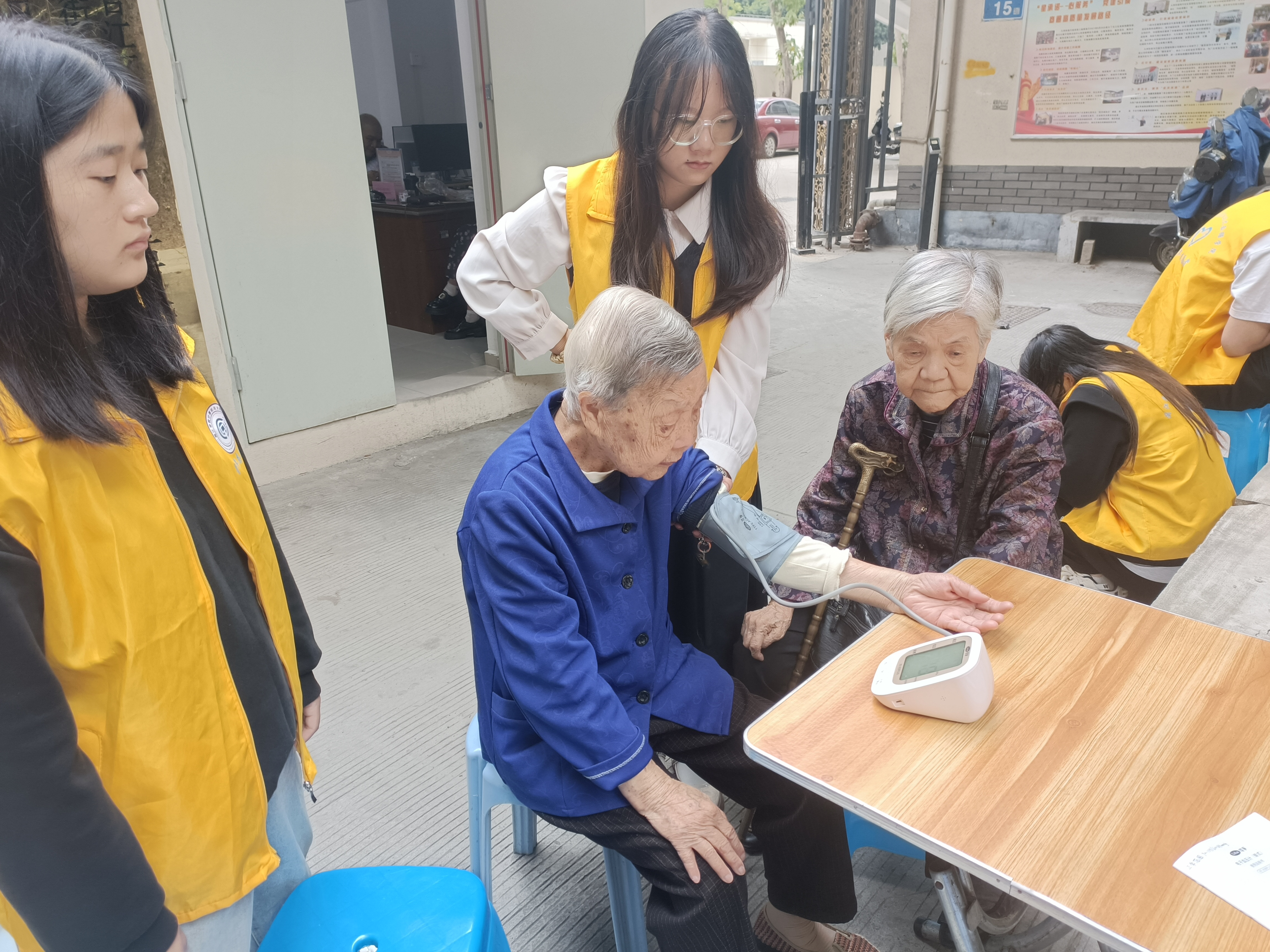 第一周,同学们早早地来到义洲街道长寿园社区,身着统一的志愿者服装,手持工具箱,为社区的居民们耐心地解答各种问题,提供一系列贴心的服务,包括量血压、手机贴膜等便民服务。