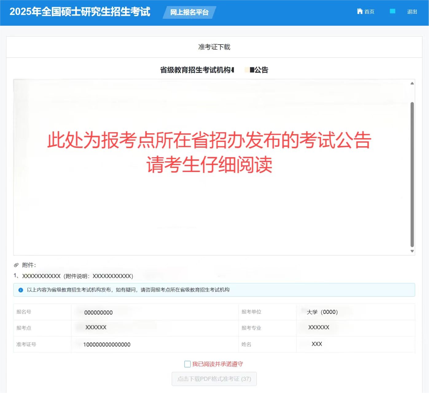 各位考生请注意,这个页面上的提示一定要认真阅读,然后勾选“我已阅读并承诺遵守”后,再点击“下载PDF格式准考证”的按钮。