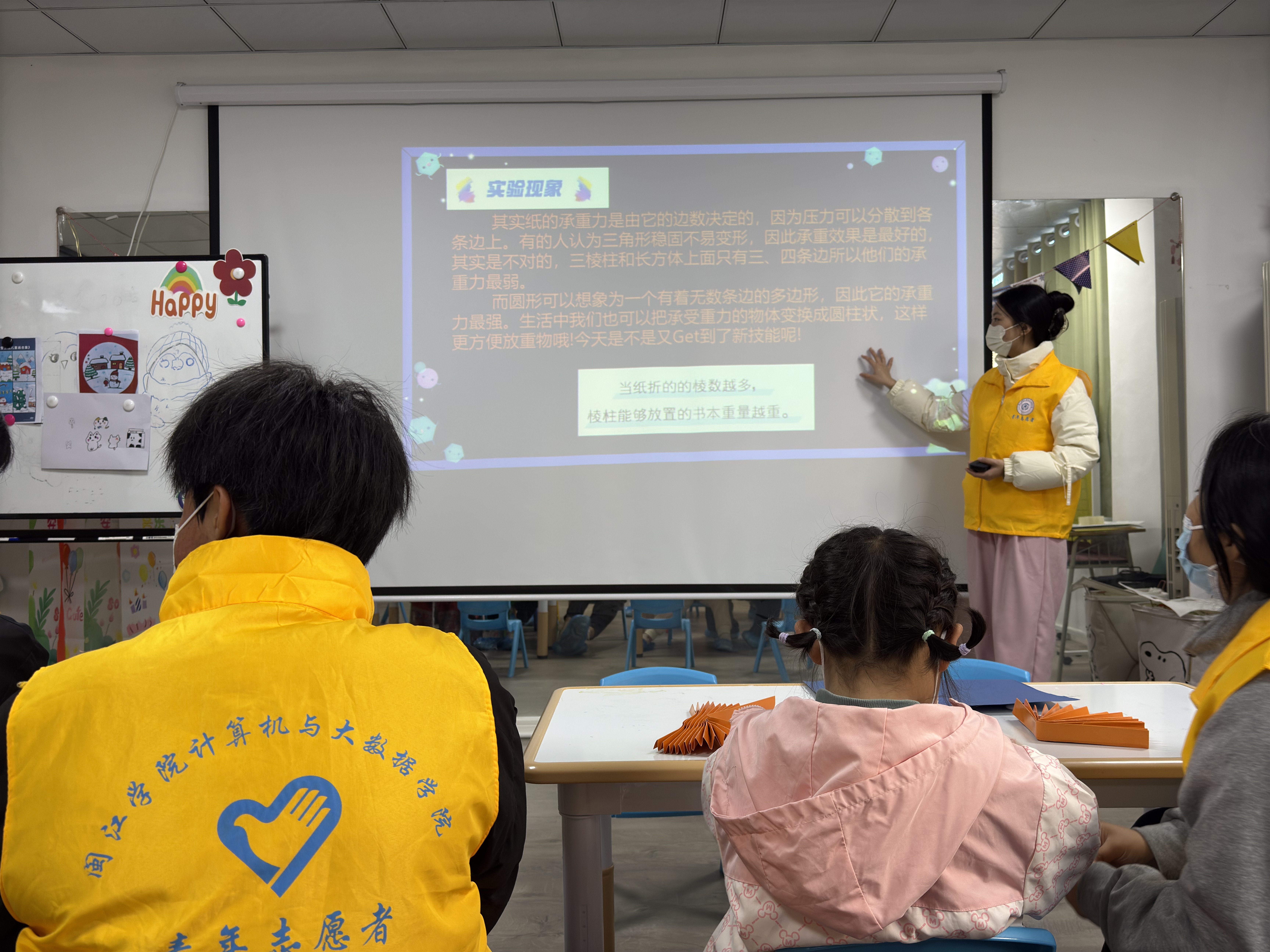 理论讲解过后,志愿者小老师为小朋友们精心设计了手工实践环节,带领小朋友们利用卡纸,感受三角形的稳定性,并通过动手操作得出,相同材料不同形状的物体所能承重的效果不同。最后志愿者小老师带领孩子们制作生活中的各种物体,将一张张普通的纸变成了扇子、纸飞机等作品,教室内欢声笑语,氛围融洽。