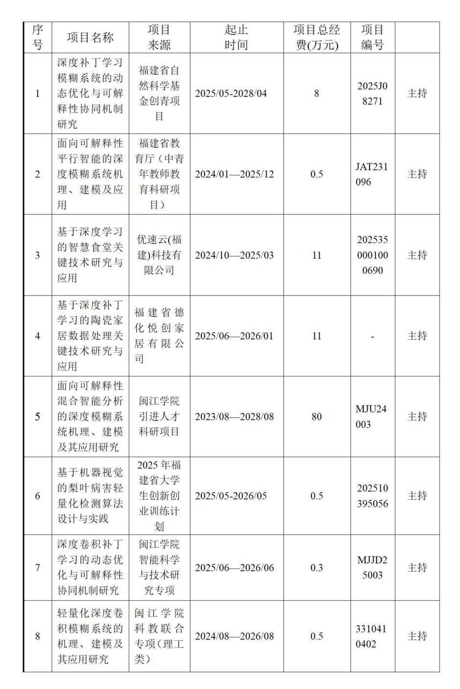 科研成果: 论文 [1] Y. Huang(黄允浒), D. Chen*, W. Zhao, Y. Lv, S. Wang. Deep patch learning algorithms with high interpretability for regression problems[J], International Journal of Intelligent Systems, 2022, 37(11):8239-8276. (SCI 收录,中科院一区, JCR 1区,Top期刊, IF:8.993) [2] Y. Huang(黄允浒), D. Chen*, W. Zhao, Y. Lv. Fuzzy c-means clustering based deep patch learning with improved interpretability for classification problems[J], IEEE Access, 2022, 10: 49873-49891. (SCI 收录, 中科院三区, IF:3.367) [3] Y. Huang(黄允浒), D. Chen*, W. Zhao, H. Mo. Deep fuzzy system algorithms based on deep learning and input sharing for regression application[J], International Journal of Fuzzy Systems, 2021, 23(3): 727-742. (SCI 收录,中科院二区, IF:4.673) [4] Y. Huang(黄允浒), G. Lin*, D. Chen*, W. Zhao. Deep neural-fuzzy system algorithms with improved interpretability for classification problems[J], International Journal of Fuzzy Systems, 2024, 26, 900–921.(SCI 收录, 中科院三区,IF:4.673) [5] Y. Huang(黄允浒), G. Lin*, D. Chen*, W. Zhao, M. Fu. Optimize deep neural fuzzy system algorithms for regression problems[J], International Journal of Fuzzy Systems, 2025. https://doi.org/10.1007/s40815-025-01998-y [6] Huang Y(黄允浒), Lai W, Chen D*, Lin G,* Yin J.* Enhanced intelligent train operation algorithms for metro train based on expert system and deep reinforcement learning. PLoS One, 2025, 20(5): e0323478. https://doi.org/10.1371/journal.pone.0323478(SCI 收录, 中科院三区,JCR 1区IF:2.9) 软件著作权 (1)william威廉官网; 基于神经模糊系统算法的分类软件V1.0, 2024SR0640462, 原始取得, 全部权利, 2024-05-08 (软件著作权) (2)黄允浒; 陈德旺; 赵文迪; 基于深度学习的深度模糊系统回归预测软件V1.0, 2021SR1279715, 原始取得, 全部权利, 2021-10-18 (软件著作权) (3) 赵文迪; 陈德旺; 黄允浒; 基于ANFIS的深度神经模糊系统回归预测应用软件V1.0, 2021SR0978053, 原始取得, 全部权利, 2021-6-15 (软件著作权) (4) 童文林; 陈德旺; 黄允浒; 基于模拟退火与规则约简的模糊系统回归预测软件V1.0, 2020SR1619713, 原始取得, 全部权利, 2020-10 (软件著作权) (5) 蔡际杰; 陈德旺; 黄允浒; 基于粒子群优化的模糊系统自学习算法回归软件V1.0, 2020SR1619706, 原始取得, 全部权利, 2020-10-3 (软件著作权) | |||