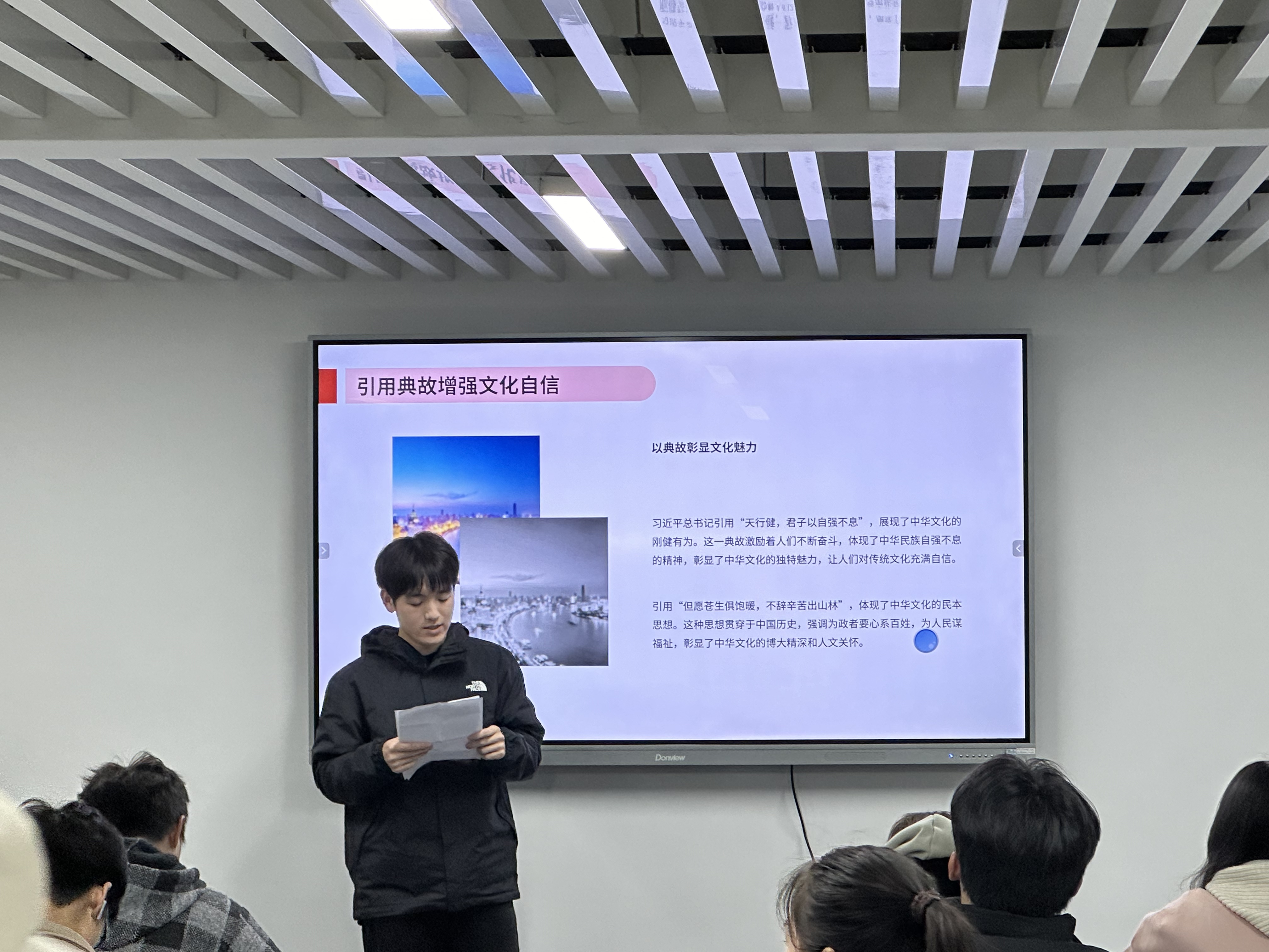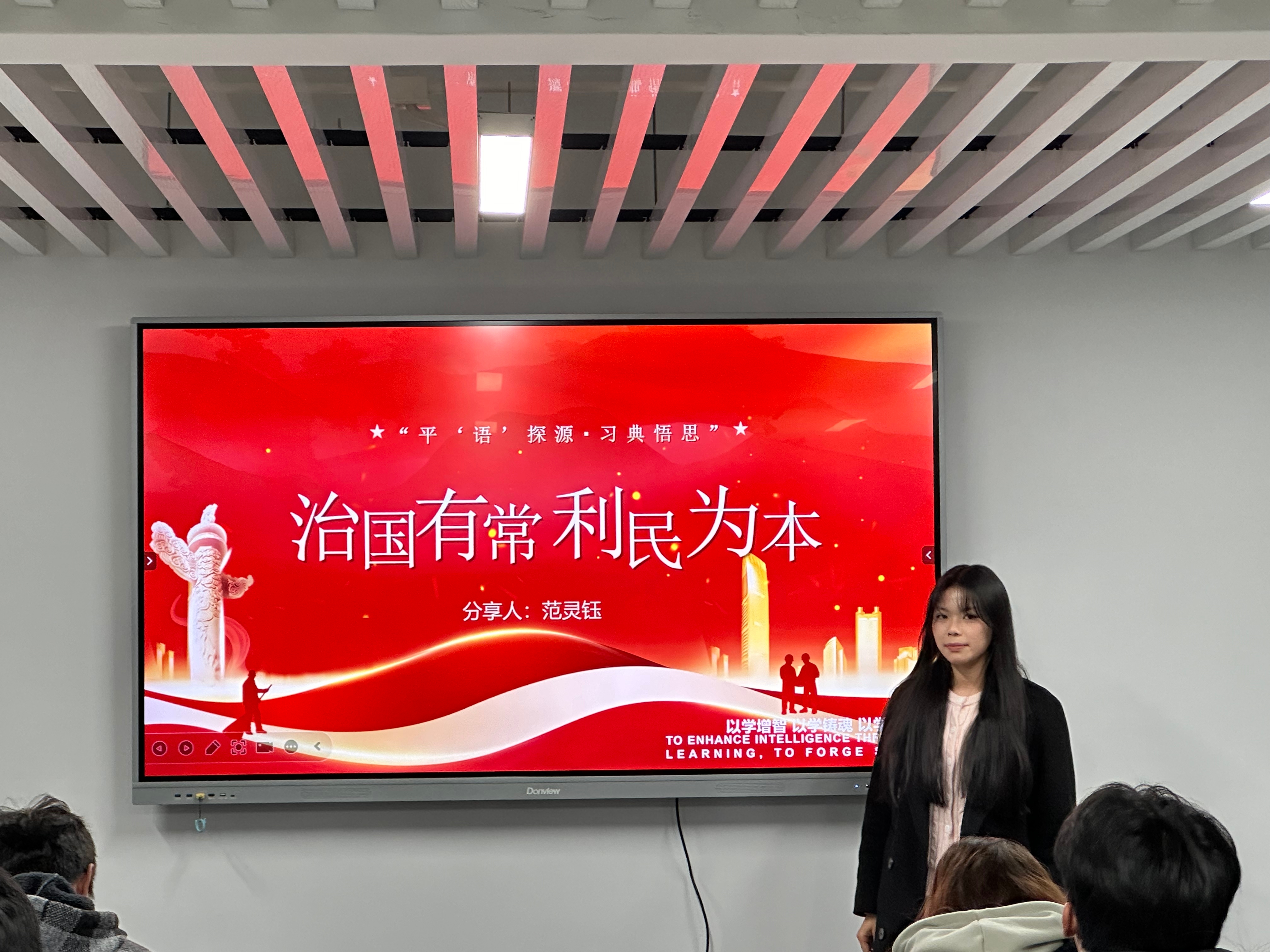 分享会上,研习社成员们围绕习近平总书记在重要讲话、文章、谈话中引用的古代典籍和经典名句展开分享。通过深入解读这些典故,挖掘其背后蕴含的深刻哲理和时代价值。有同学分享“治国有常,利民为本”这一典故,强调了以人民为中心的发展思想在当代社会的重要意义,结合计算机技术在便民服务领域的应用,探讨了如何运用专业知识为人民群众创造更多福祉。还有同学解读了“苟日新,日日新,又日新”,阐述创新在科技发展中的核心地位,鼓励大家在学习和科研中勇于突破,积极创新。