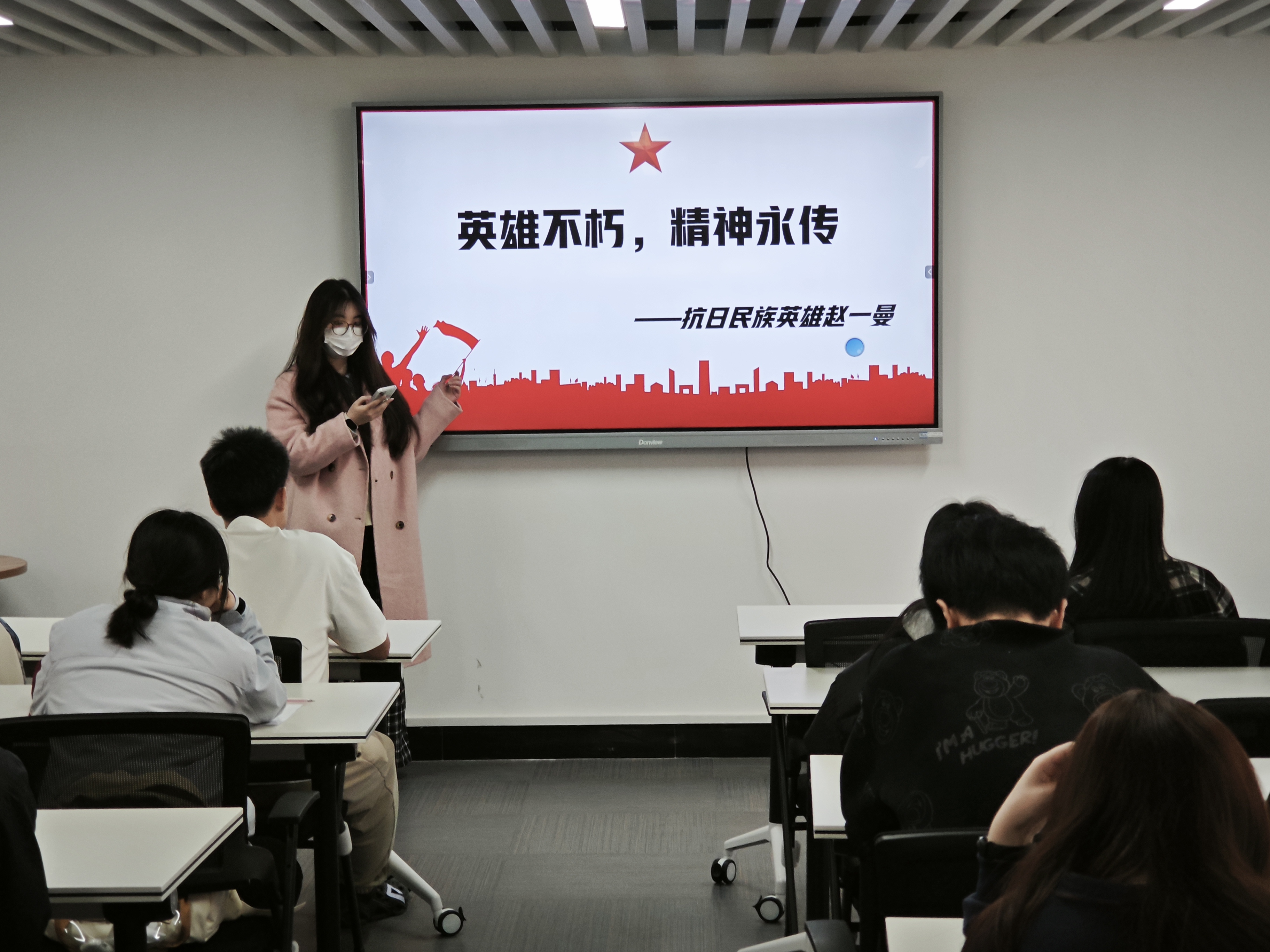 在活动过程中,八位同学依次上台分享,缅怀英雄们的丰功伟绩与崇高精神。王雨欣同学讲述了在东北抗日浴血奋战,以草根、棉絮充饥,战斗几个昼夜,在艰苦绝境下牺牲的杨靖宇的英勇事迹;杨兹豪同学讲述了在解放战场上,用血肉之躯托举炸药,炸毁敌人碉堡,在激烈战斗中捐躯的董存瑞的英雄壮举;曾烊洋同学追忆了抗击日寇,凭借顽强意志扛住刑罚,坚持多日,在残酷逼问下英勇就义的赵一曼的感人故事;冯宇翔同学从一张跨越生死的全家福照片引入,讲述了在渭华起义中壮烈牺牲的早期共产党员温济厚的故事。在分享过程中,同学们还结合自己的专业进行思考如何在当下传承弘扬革命先烈的奉献精神,投身中国式现代化建设。