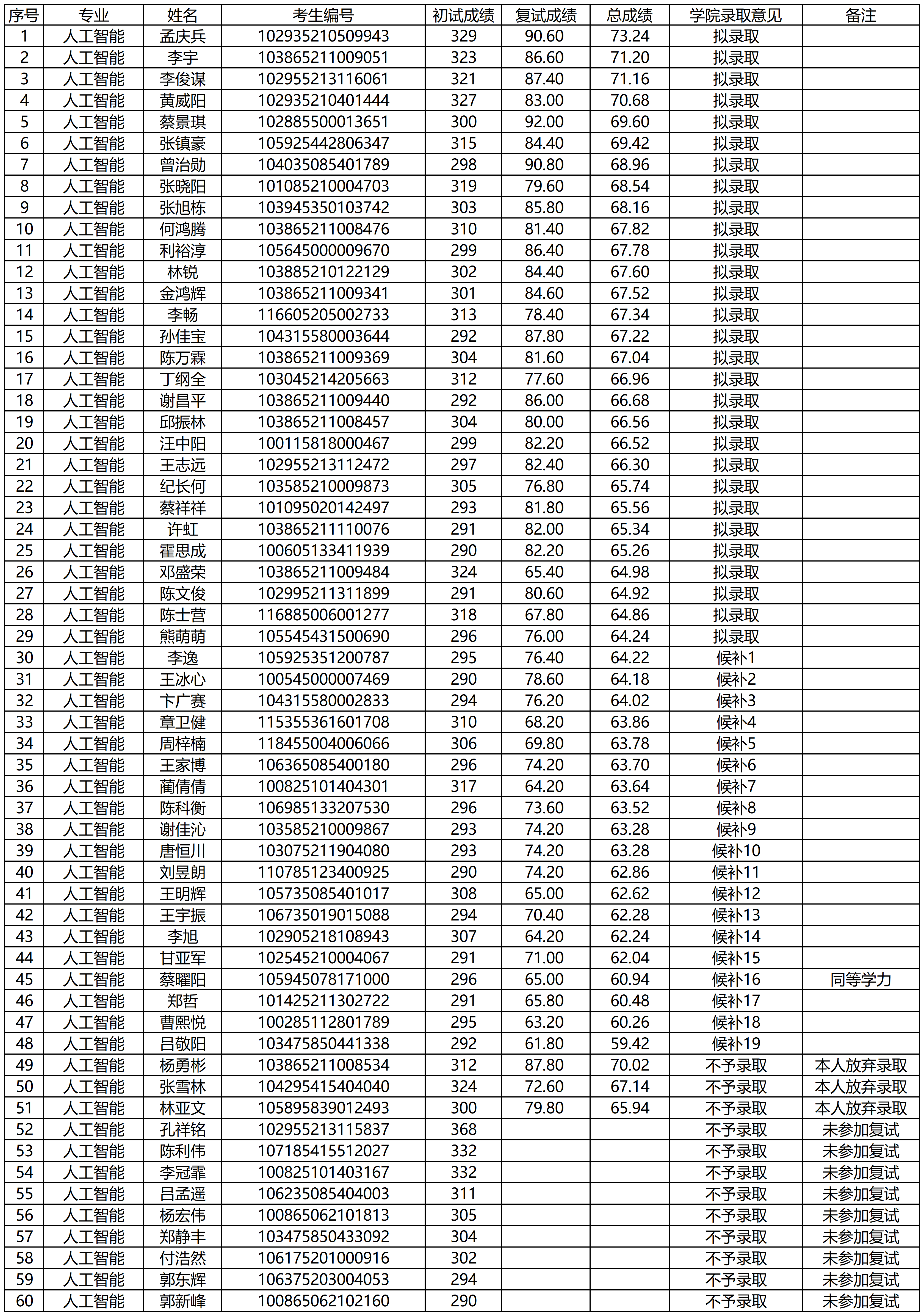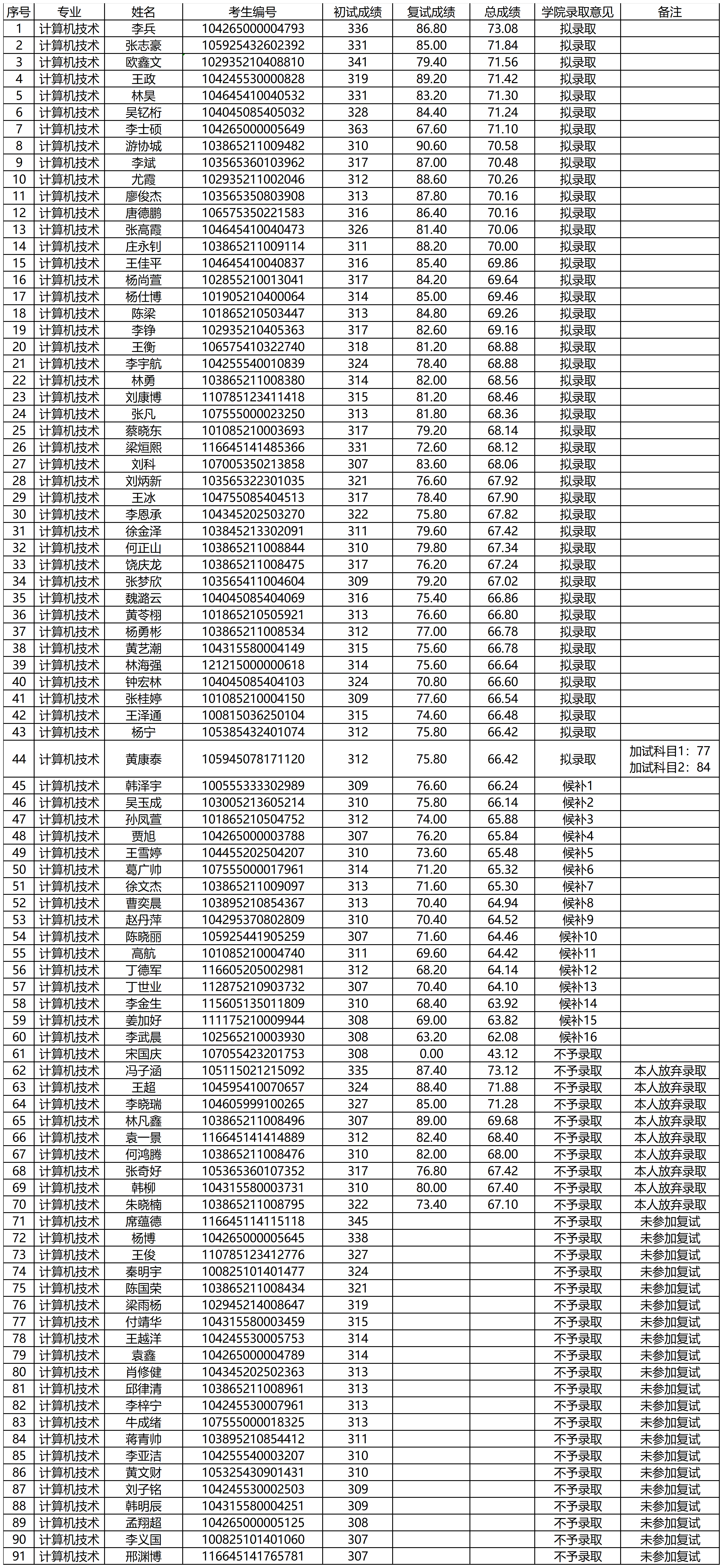 特别说明:“候补”名单为满足计算机与大数据公司招生资格,但复试初试总成绩排名低于此批次招生计划的考生。若有拟录取的考生放弃录取资格或追加招生计划,将按照候补顺序按序补录。因候补录取具有不确定性,因选择等候候补录取名额而导致丧失其它调剂机会的后果,由考生自行负责。