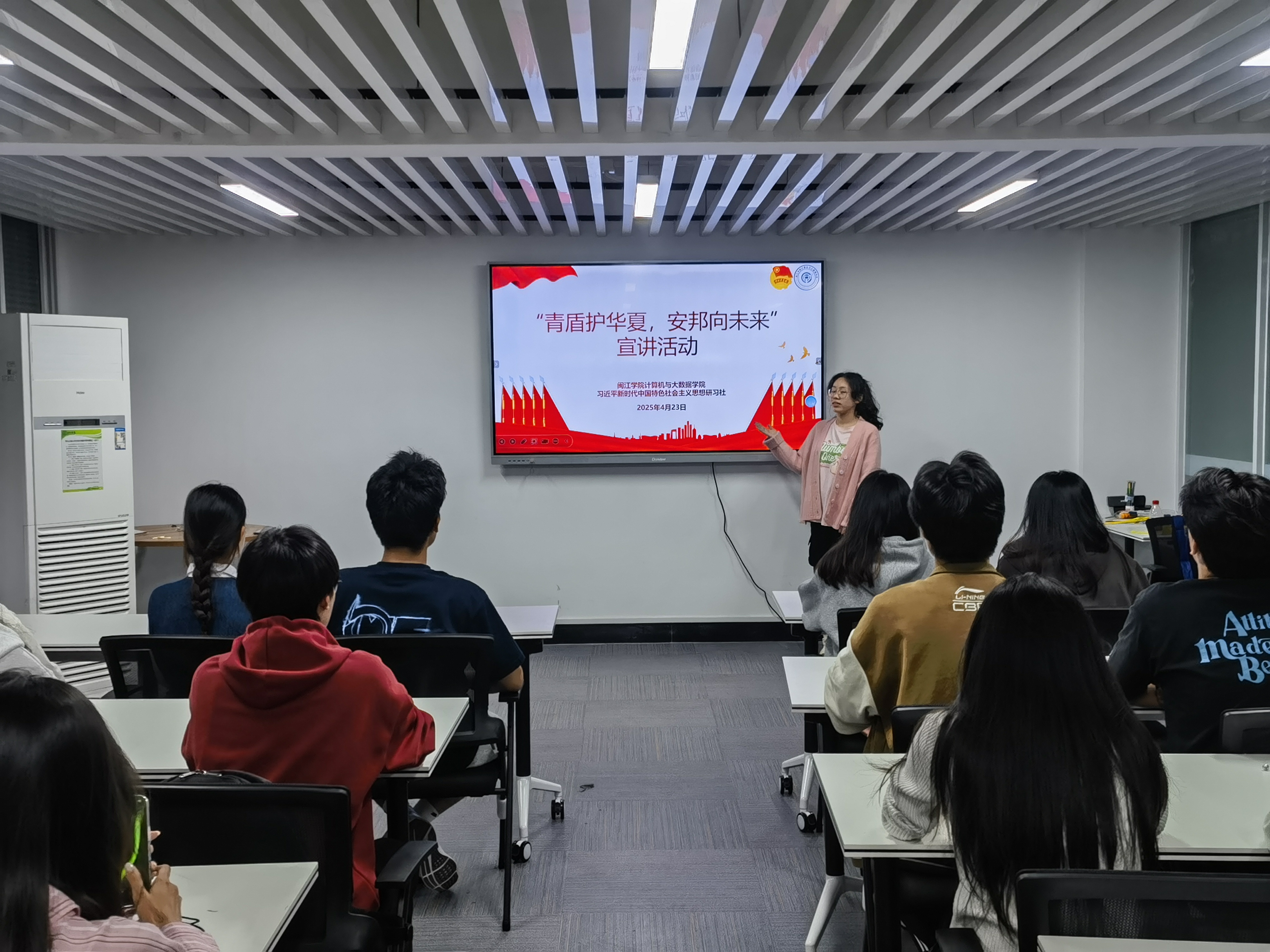 为深入学习贯彻习近平总书记关于总体国家安全观的重要论述,2025年4月23日,william威廉习近平新时代中国特色社会主义思想研习社开展了以“青盾护华夏,安邦向未来”为主题的宣讲活动。通过宣讲引导同学们理解总体国家安全观的丰富内涵,认识维护国家安全的重要性,激发同学们将国家安全理念融入自身专业学习和生活实践的积极性。