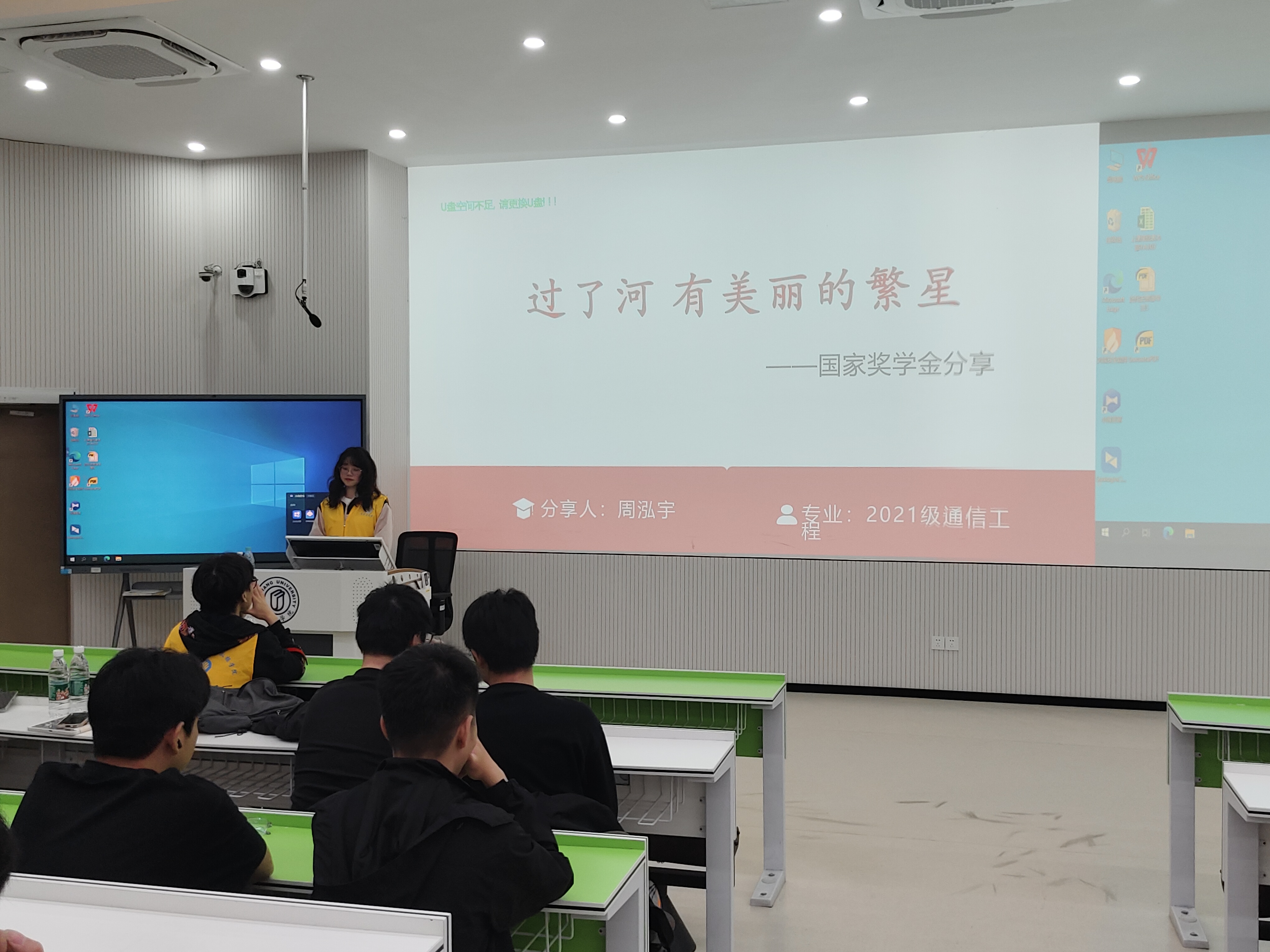 周泓宇同学,国家奖学金获得者、2021 级通信工程专业员工。她以“过了河,有美丽的繁星”为主题,从自己的学业情况、科研竞赛、技能拓展三个方面分享自身经历,告诉大家目标和规划在成长过程中的重要性。在分享过程中她提到:“没人能困住你,除了安于现状的自己”,建议学弟学妹要主动踏出舒适区,去尝试未曾接触过的新鲜事物、学习新的技能、迎接未知的新挑战。她鼓励学弟学妹们,要拥有不怕输的精神,要深知自己肩负的时代使命,奋勇向前,以强大的毅力投身于学习与实践当中,努力创造属于自己的一片天地。