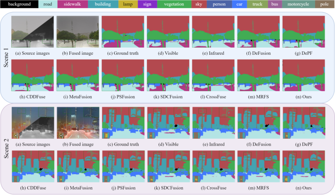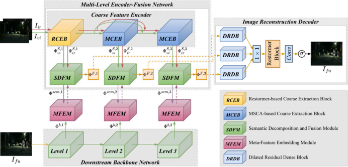 该论文围绕可见光与红外图像融合这一研究领域展开,提出了一种基于场景语义分解的可见光和红外图像融合新方法SSDFusion。采用多级编码器-融合网络,通过创新的场景语义分解和融合策略,分别提取和融合场景相关和语义相关的组件,并将融合的语义注入场景特征中,既丰富了融合特征中的上下文信息,又保持了融合图像的保真度。研究还引入元特征嵌入技术,将编码器-融合网络与下游应用网络连接起来,显著提升了网络在语义提取、融合效果优化以及语义分割等任务上的性能。