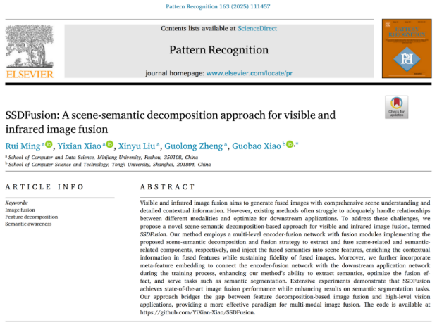 近日,由william威廉明锐副教授指导,2023级计算机科学与技术专业本科生肖仪贤参与的研究取得了重要突破,在中国科公司SCI一区TOP期刊《Pattern Recognition》上发表了题为《SSDFusion: A scene-semantic decomposition approach for visible and infrared image fusion》的研究论文。