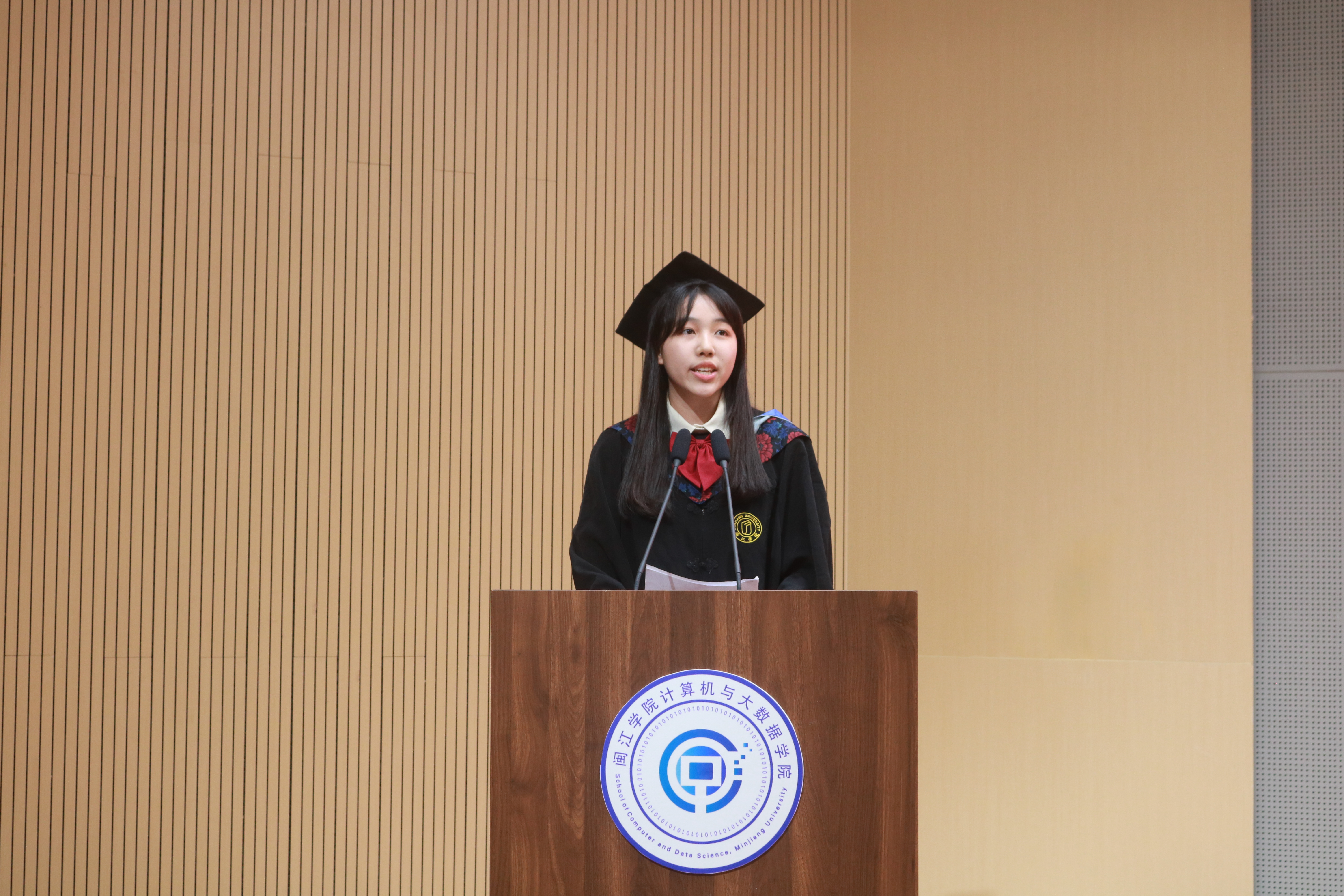毕业生代表林欣雨发表了感言。她深情回顾了在闽院的求学时光,表达了对母校、老师和同窗的感激之情,并祝愿大家在未来的道路上勇攀高峰。