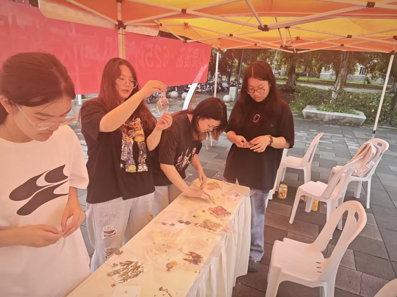 “自然之语,心灵之花——制作创意书签”活动中,同学们围坐在一张张铺满了透明贴、瓶子和各类配饰的桌子旁,空气中弥漫着淡淡的花香和树叶的清新气息。这里充满了自然的生机与手工的温暖,仿佛是一个可以释放压力、激发创造力的小天地。大家小心翼翼地挑选着自己喜欢的树叶和鲜花,进行简单的处理和组合。然后,用透明贴将这些自然元素固定,制作成独特的书签。在这个过程中,同学们的脸上洋溢着专注与喜悦。随着一个个创意书签的完成,整个活动现场仿佛被温暖的氛围包围。这些小小的书签,不仅承载着同学们的创意和心意,更增添了一份阅读的趣味。
