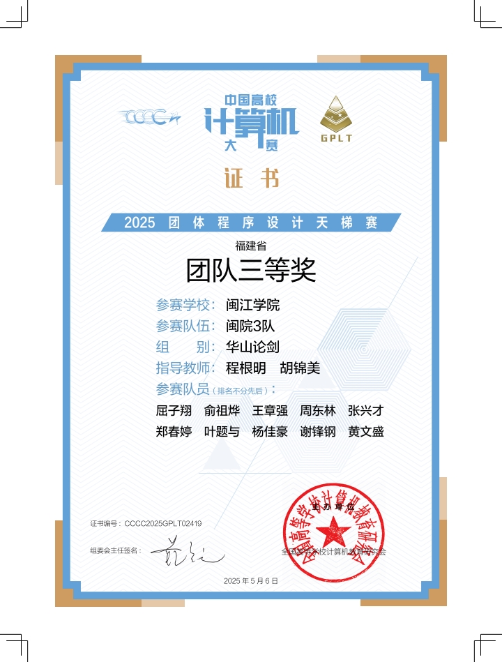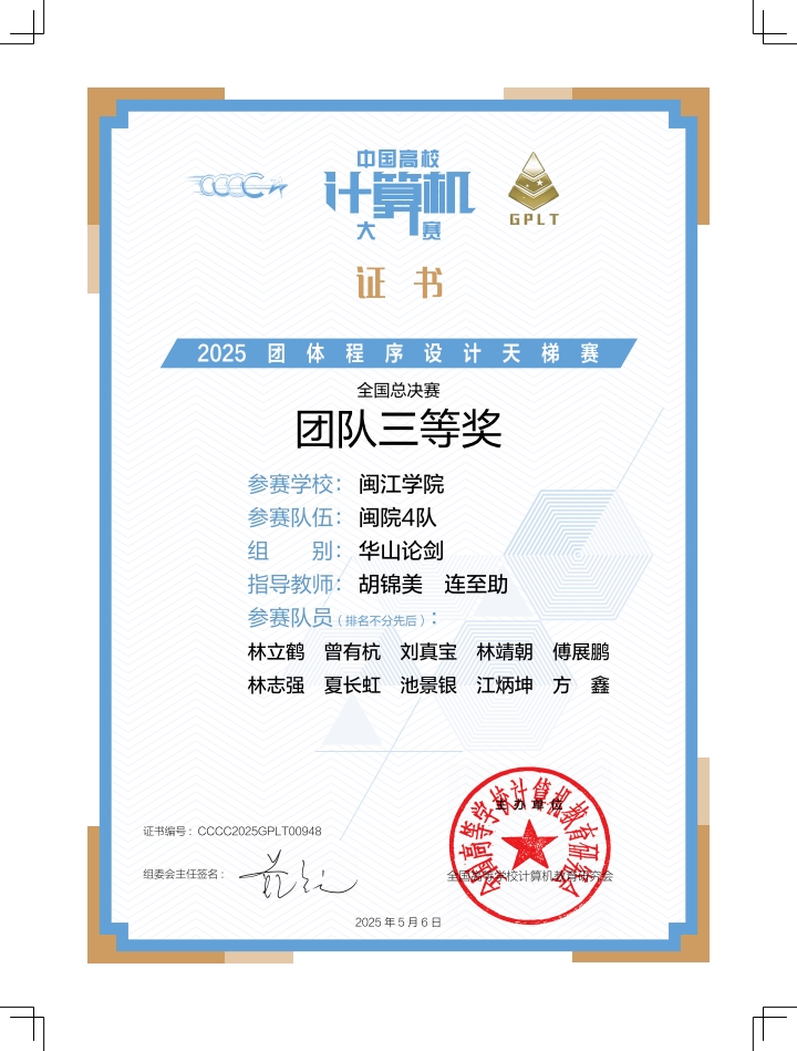 近日,​william威廉学子凭借出色表现,在2025年“中国高校计算机大赛-团体程序设计天梯赛”荣获全国总决赛三等奖1项,以及团队省级二等奖1项、三等奖2项。
