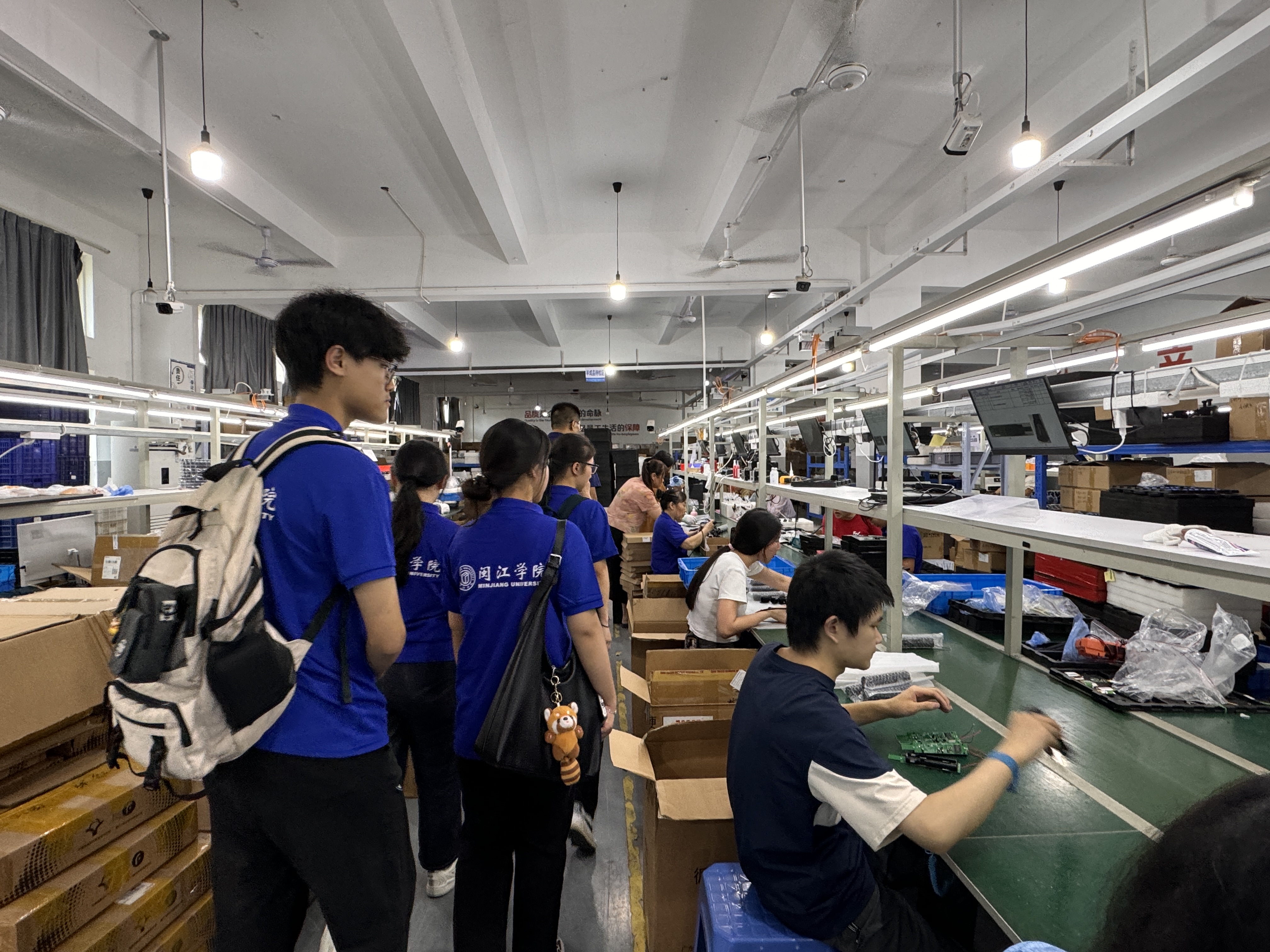 最后一站,实践队伍来到了福州金威航信息科技有限公司,该公司主要从事电子产品的生产制造。公司负责人向团队展示了公司自主设计开发的产品——便携随心屏,详细讲解了技术原理、多元化应用场景与应用前景。此外,师生们近距离观摩了公司自主研发的麦克风硬件模块、精密电路板并参观公司现有的焊接工艺生产线车间、播音设备体验室、样品室、测评室。实践队员感叹,从一块小小的 电路板到一个完整的产品,原来要经过如此多道复杂的工序。