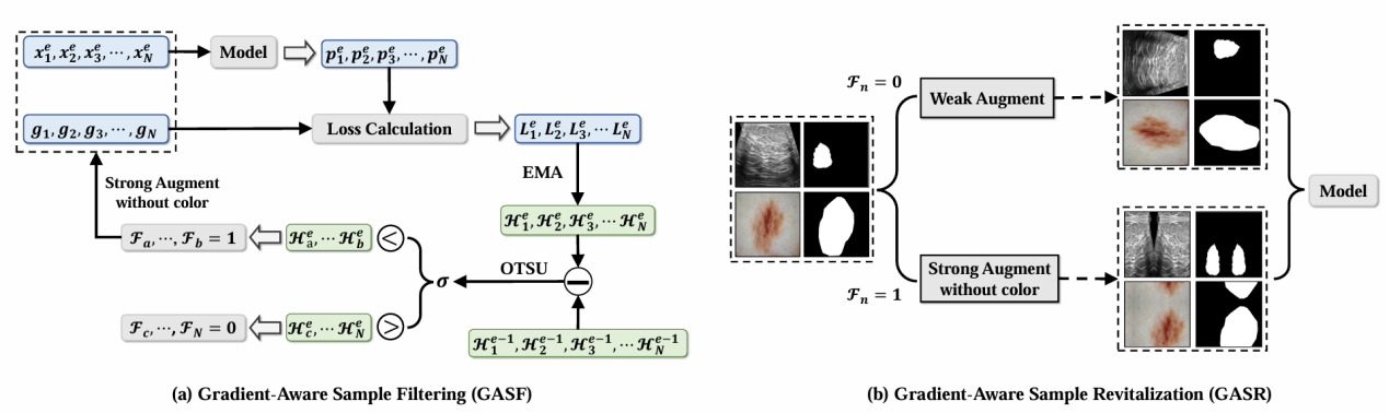简介:基于深度学习的医学图像分割因其精准的病灶定位能力,已成为多模态医学应用和智能辅助诊断系统中的核心组成部分。近年来,网络架构的不断创新显著提升了分割性能。然而,在模型优化过程中,非有效样本(Non-Effective Samples, NES)却鲜有受到关注。这类样本在训练过程中表现出损失函数梯度变化微弱,对模型优化的贡献极小。他们既包括损失值趋近于零的易分割样本,也包括始终保持高损失值的难分割样本。尤其是当NES大量积累时,模型易陷入优化停滞的困境,造成训练效果的瓶颈。为应对这一问题,我们提出了一种轻量级、即插即用的策略-基于梯度感知的样本选择与再激活策略(Gradient-Aware Sample Selection and Reactivation Strategy, GA-SRS),用于高效识别并激活NES的训练潜力。首先,GA-SRS基于样本的历史训练信息及其在训练过程中的损失梯度变化,筛选出NES;随后,通过强数据增强操作,来重新激活这些样本的训练值。
