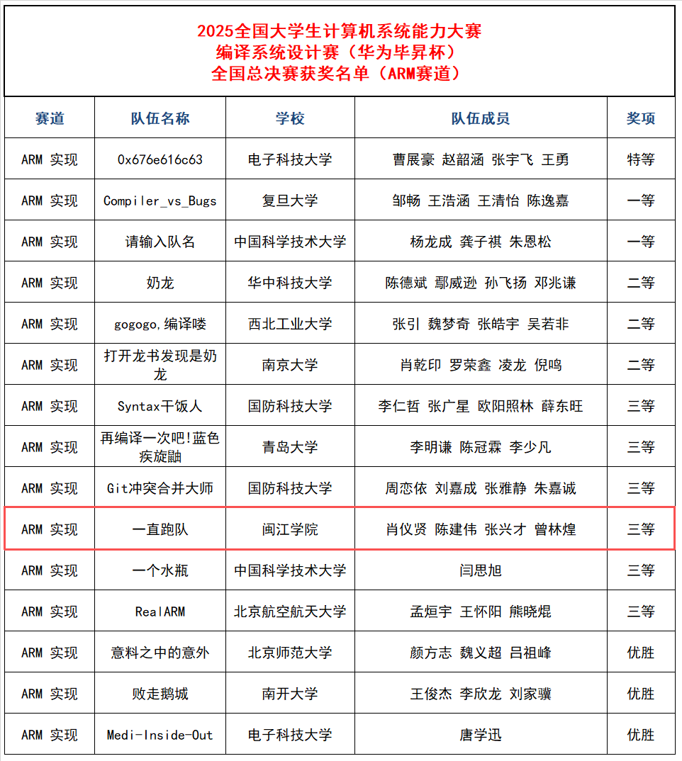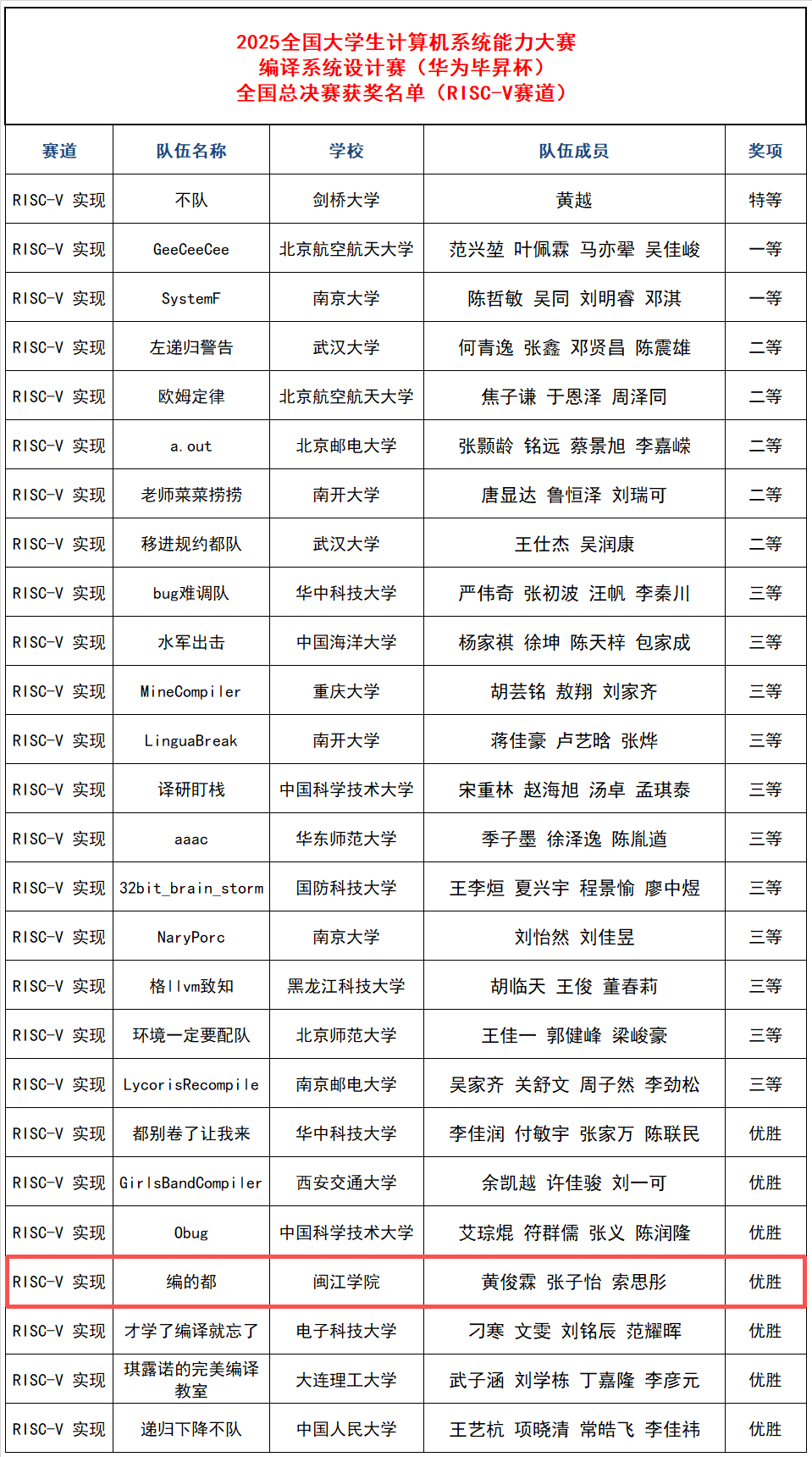 附件:2025年全国老员工计算机系统能力大赛编译系统设计赛(华为毕昇杯)全国总决赛获奖名单