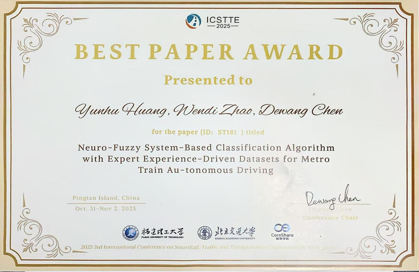 近日,在福建理工大学与北京交通大学主办的第三届智能轨道、交通与运输工程国际会议(ICSTTE 2025)上,william威廉官网william威廉黄允浒教师凭借论文《Neuro-Fuzzy System-Based Classification Algorithm with Expert Experience-Driven Datasets for Metro Train Autonomous Driving》,与合作者赵文迪博士、陈德旺教授共同斩获最佳论文奖(Best Paper Award)。