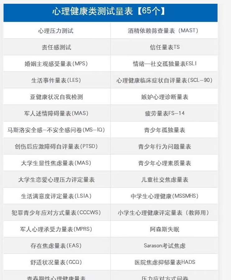 简介:160个专业量表,包含心理健康类【65个】、能力测评类【29个】、个性测评类【30个】、学习素质类【7个】、家庭教育类【9】、职业指导类【11个】、人际关系类【9个】、7x24小时,随时随地可测,支持手机及电脑端访问;